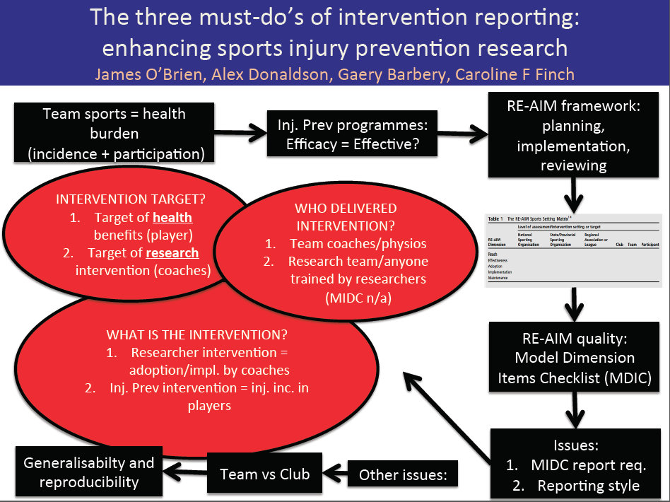 1. O’Brien J, Donaldson A, Barbery G, Finch CF. The three must-do’s of intervention reporting: enhancing sports injury prevention research. British Journal of Sports Medicine 2013;