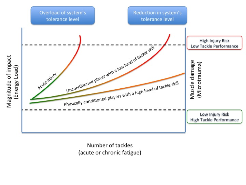 Players may have an upper limit for being able to endure repeated high energy impact tackles. If this upper limit is exceeded the risk of injury is substantially increased, and tackle performance is noticeably decreased (figure below). This upper limit is reached either through one or more very high-energy impact contact situations or, accumulates over a match or season following repetitive lower-energy impact situations. However, effective tackle skill training, proper physical conditioning, strength, power, equipment and attitude/motivation can offset this upper limit (McIntosh, 2005). For example, physically conditioned players with a high level of tackle skill may have the technical ability and physiological capacity to minimise the energy load on the body, thereby increasing their tolerance level for physical loads.