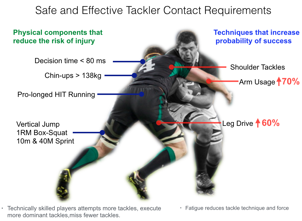 In rugby union and rugby league studies, the specific physical and technical requirements for safe and effective contact in the tackle have been highlight (summary of tackler below).