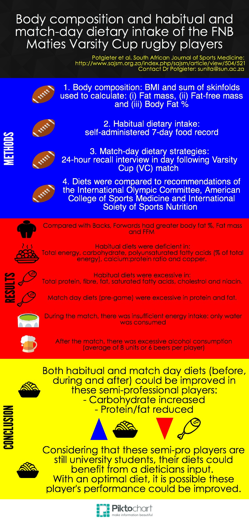 This week, we feature an infographic of a manuscript published in the South African Journal of Sports Medicine by Potgieter and colleagues: “Body composition and habitual and match-day dietary intake of the FNB Maties Varsity Cup rugby players“.