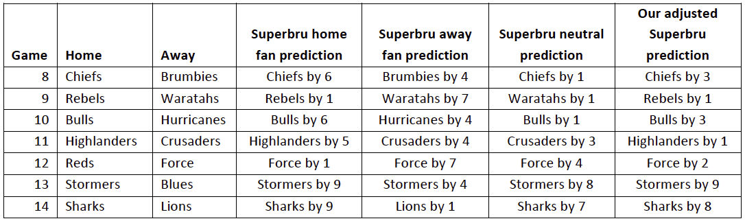 This week we’re adding two new elements to our model. Firstly, the good folks at Superbru have provided us not just with the overall prediction given by their users, but how those predictions differ between fans of the teams involved, and neutrals. From some of our previous research we know that fans tend to overestimate their team’s prospects by about 5 points. That means we can adjust for that bias, as well as the home ground bias we talked about last week, before making our own predictions.