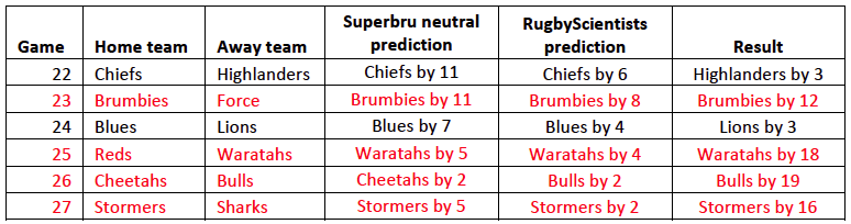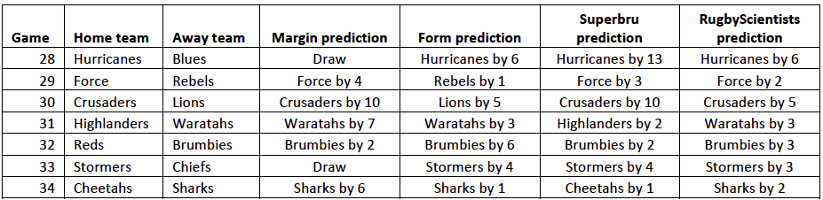 This weekend’s games are harder to call than any round this season. Our margin, form, and Superbru predictions all point in different directions, with the only game out of the seven where they coincide being the Brumbies–Reds game. The Waratahs big win over the Reds last weekend has made our model pick them to beat the Highlanders, who beat the impressive Chiefs by a few points last weekend. Failing to take into account the strength of a team’s previous opposition is a weak spot in our model – any ideas?