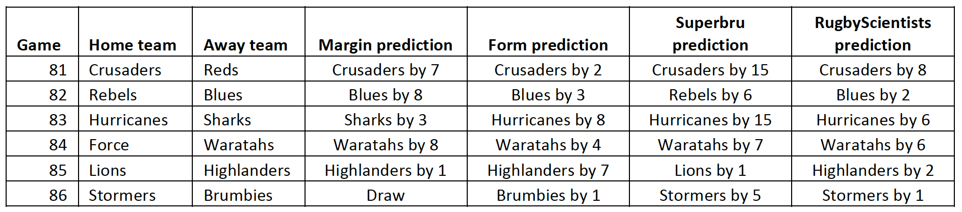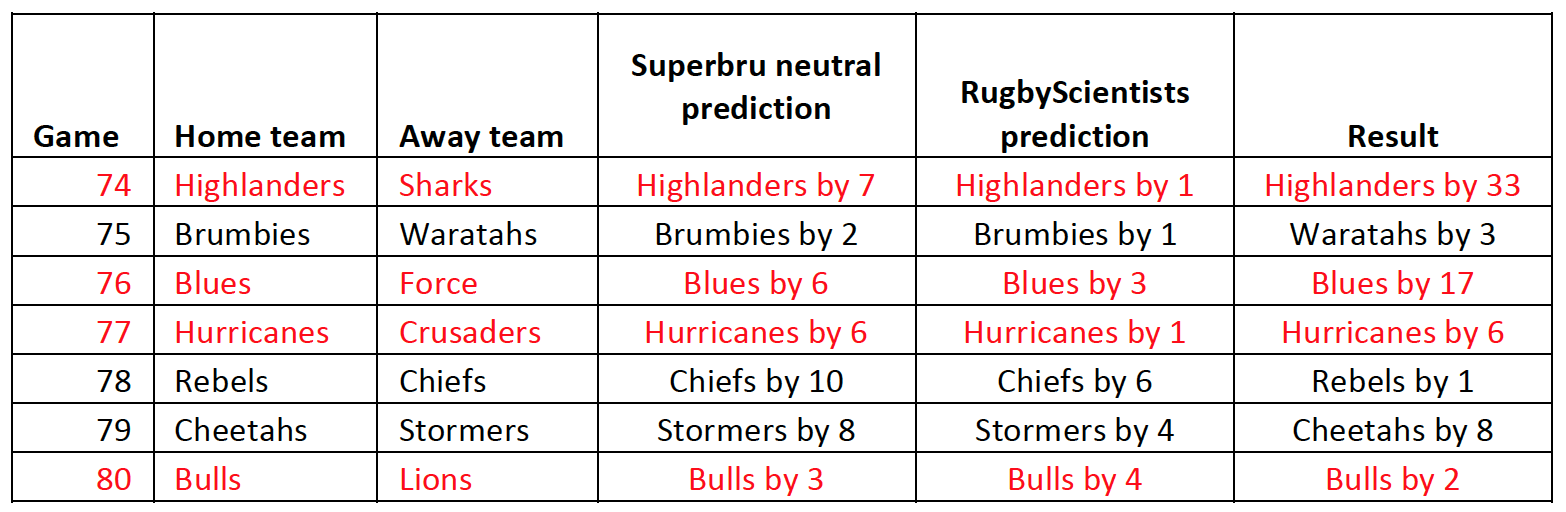 Round 12 saw two unexpected results, with very few picking the Rebels to beat the Chiefs or the Cheetahs to beat the Stormers. Since both the Rebels and Cheetahs were unexpected home-side victories, we looked a bit closer at whether teams playing at home are doing relatively better later on in the competition. The plot below shows, round by round, the proportion of home sides winning. The blue line gives the best fit to the data – it looks like home sides do a little better as the competition progresses. It’s a small effect at best, but worth keeping an eye on. Perhaps playing at home partially offsets the fatigue that sets in later in the competition?