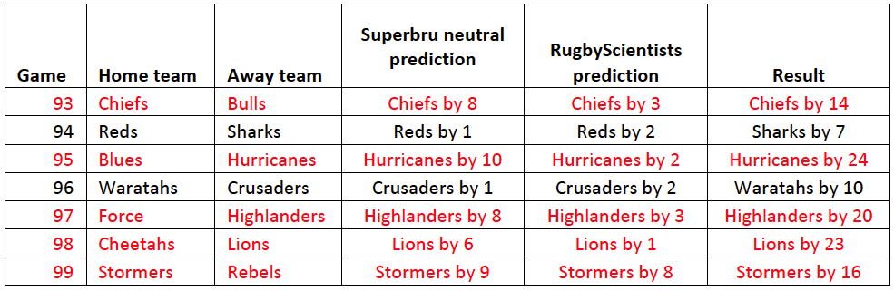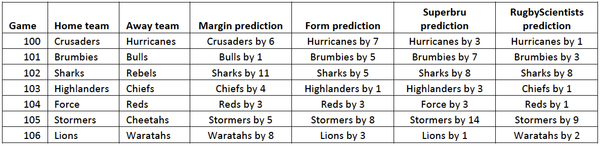 Here are the outcomes for last weekend followed by predictions for the weekend ahead. Only the Stormers and Sharks are unanimously tipped to win, otherwise looks like a weekend of close games!