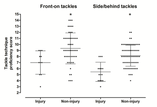 Figure 2: Tackler proficiency scores comparing injury vs. non-injury for front-on and side-on tackles.