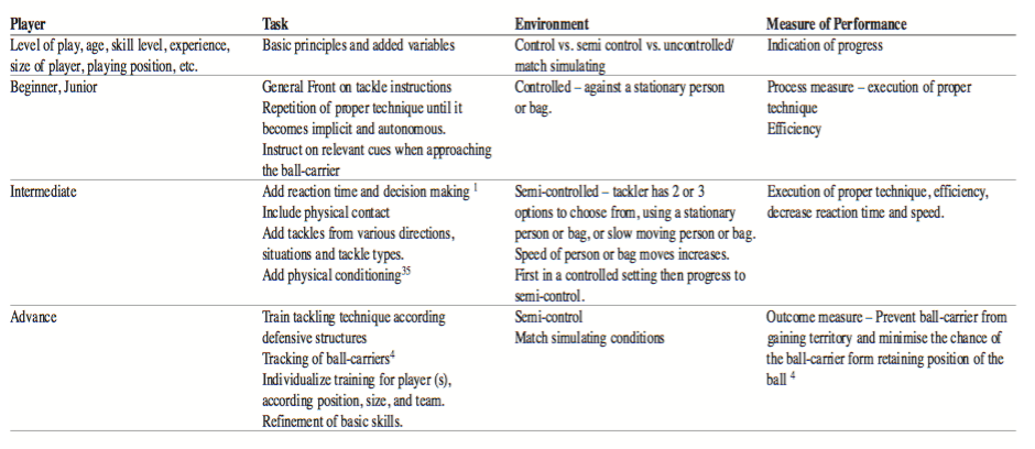 Hendricks S, Lambert M. Tackling in rugby: Coaching strategies for effective technique and injury prevention. International Journal of Sports Science and Coaching. 2010 1;1:117-36.
