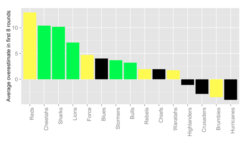 To distract you from our poor performance we thought we’d look at an interesting question: which team has the most optimistic fans in the competition? The chart below shows the average overestimate made by each team’s fan base on Superbru. From the 8 rounds played so far, Reds fans have been the most optimistic, in the sense of making the biggest overestimates of how their team is going to fare, followed by three South African franchises. Interestingly fans of most New Zealand teams actually underestimate their team’s performances!