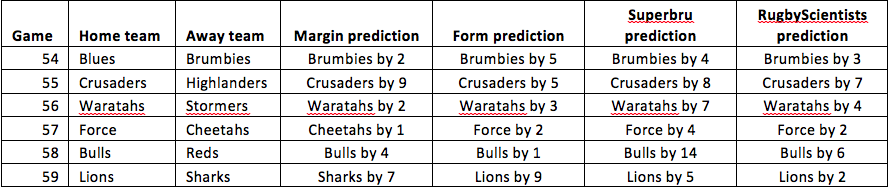 This weekend looks like an interesting bunch of games: the Crusaders and Bulls are favoured to win, by quite a margin and based on any of our criteria, but the rest of the games look much closer. Picking the Sharks to beat the Chiefs is a result of the Sharks hammering the Cheetahs in their last outing, and a bit of South African bias in the Superbru forecasts. Incidentally, we experimented a bit with weighting a team’s performance in the last game by the quality of the opposition faced, as measured by their current log standing. None of the predicted winners of the weekend’s games changed, so we’ve left things as is for now.