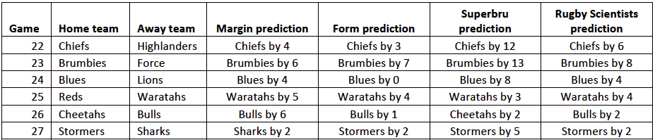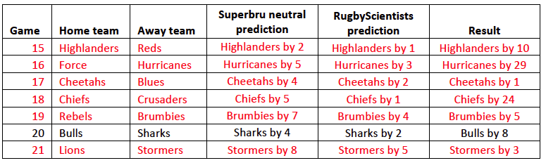 Here are our predictions for the upcoming weekend. The games outside South Africa seem a bit more clear-cut, with wins predicted across the board for the Chiefs, Brumbies, Blues, and Waratahs. There’s more uncertainty about the South African derbies. Superbru neutrals are picking the Cheetahs, but our model says the Bulls past history and win over the Sharks last week is enough to make them favourites to win. Looks like it’ll be close though!